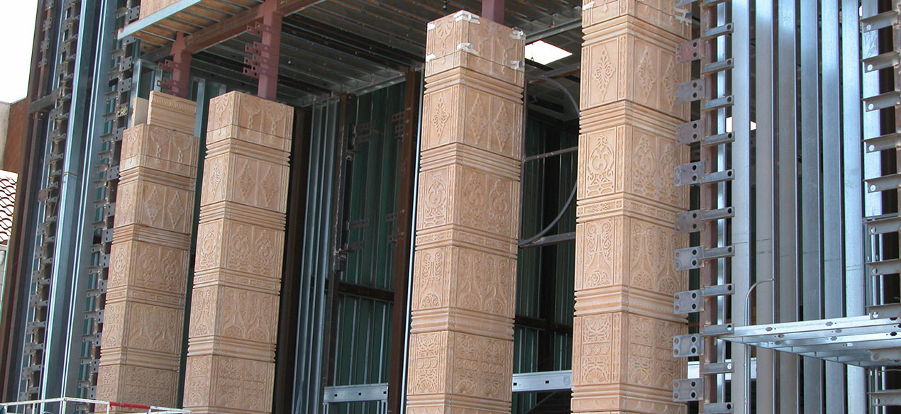 While we do build designs with no concrete or steel reinforcing, we also construct modern reinforced steel and concrete structured clad with carved and profiled stones inclusive of those suitable for earthquake-prone zones.
